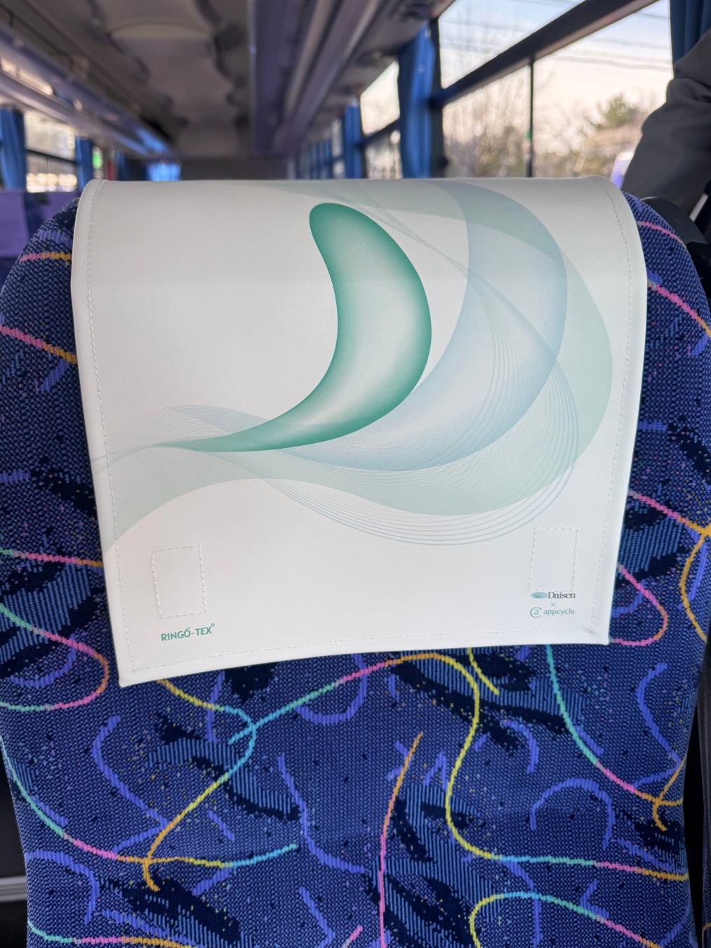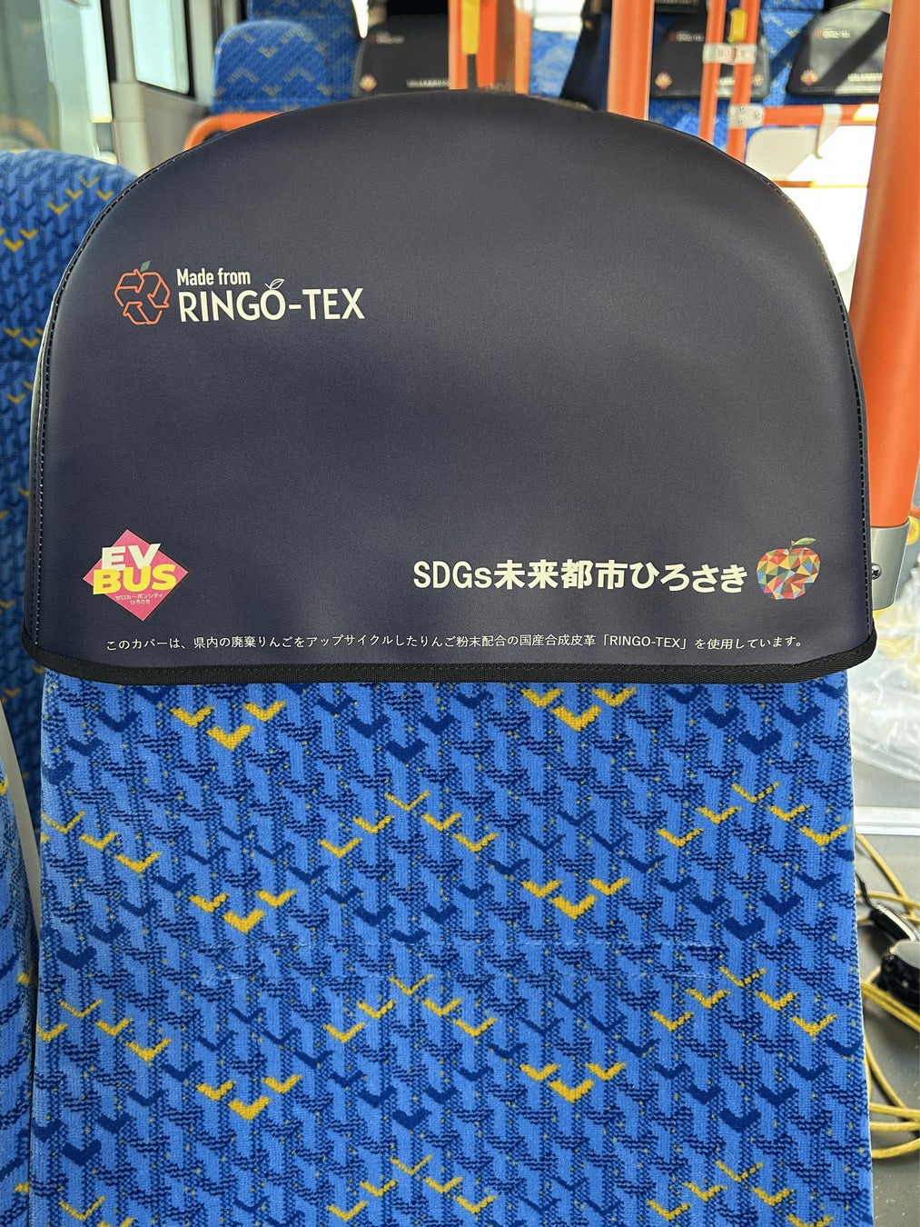 公共交通機関におけるサステナビリティ推進として、弘前市のEVバスおよび六ヶ所村の観光バスの座席ヘッドレストカバーに「RINGO-TEX®」が採用されています。