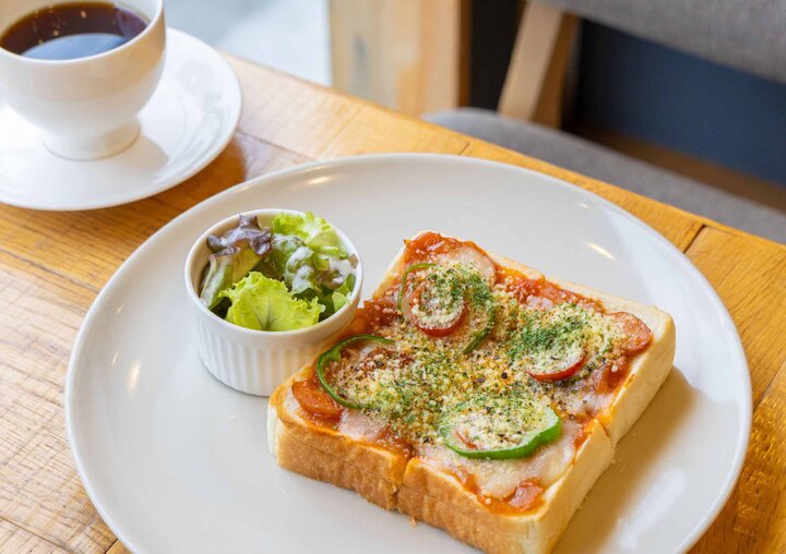 ピザトーストにサラダとドリンクが付くセットは、とろりととろけるチーズが美味。また、四枚切りの食べ応えある食パンは、壬生のベーカリー「マンハッタン」のもの。京都中の食パンを食べ尽くし、そのなかから選りすぐったそうです。じっくり味わってみましょう。