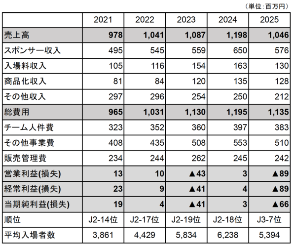 経営面におきましては、広告料収入は576百万円(前年比88.6%)、チケット収入は130百万円(前年比79.8%)、グッズ収入は128百万円(前年比94.2%)となりました。カテゴリーの変更に伴う影響はシーズン前に正確に見通すことが難しく、当初はさらに大幅な減収を想定しておりましたが、皆様の継続的なご支援・ご協力のおかげで、想定を上回る水準を確保することができました。Jリーグ配分金は25百万円(前年比23.8%)となり、当期の合計収入は1,046百万円(前年比87.3%)となりました。