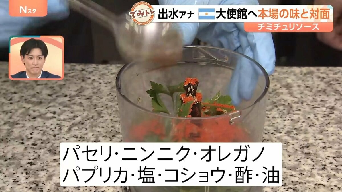 大使館のシェフに作り方も見せていただきました。そもそも「チミチュリ」とは「混ぜる」という意味で、パセリ、ニンニク、ハーブの一種オレガノ、パプリカパウダー、塩、コショウ、酢、油を入れて「混ぜる」だけで出来上がります。