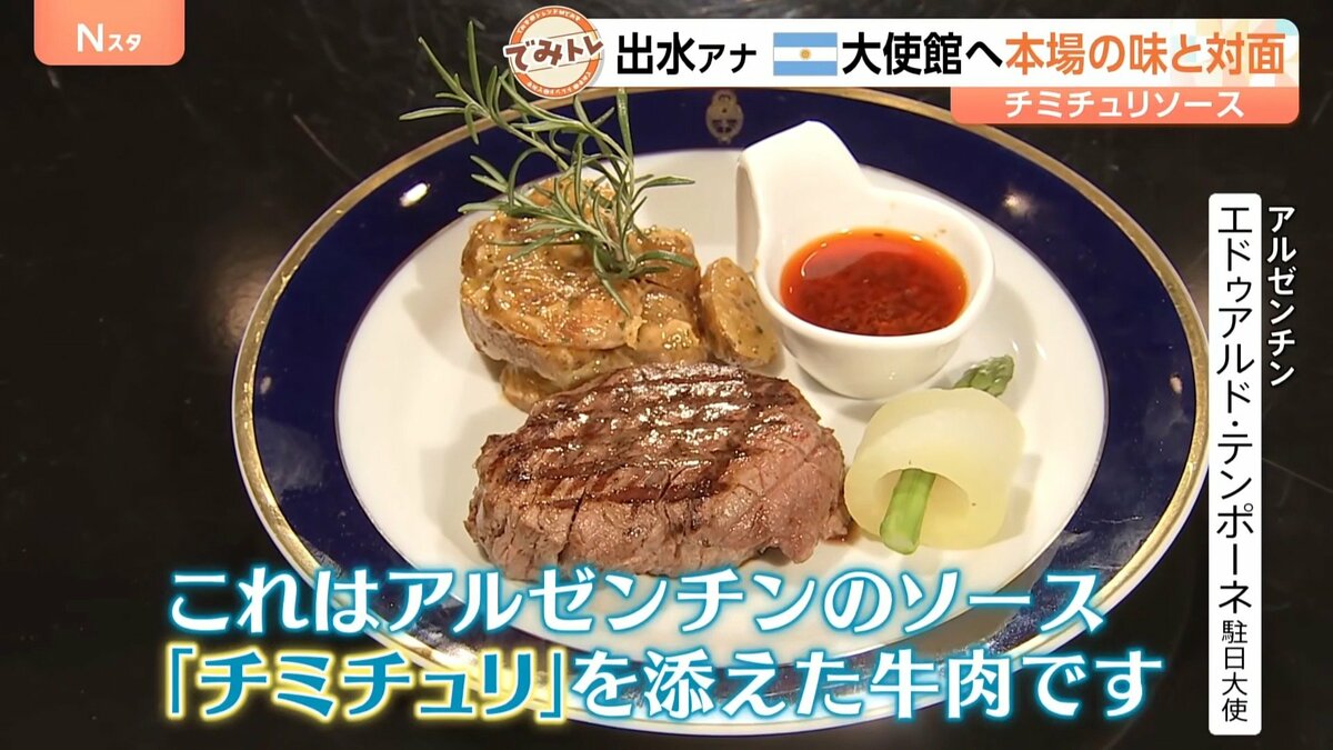 「これはアルゼンチンのソース『チミチュリ』を添えた牛肉です。牛肉を食べるときには欠かせないソースなんです」