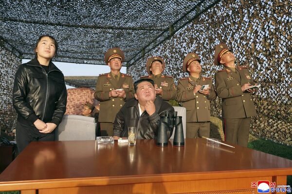 ミサイル総局が実施した戦術弾道ミサイルの試射を視察する北朝鮮の金正恩朝鮮労働党総書記(手前右)と娘(同左)(写真:朝鮮中央通信=共同通信社)
