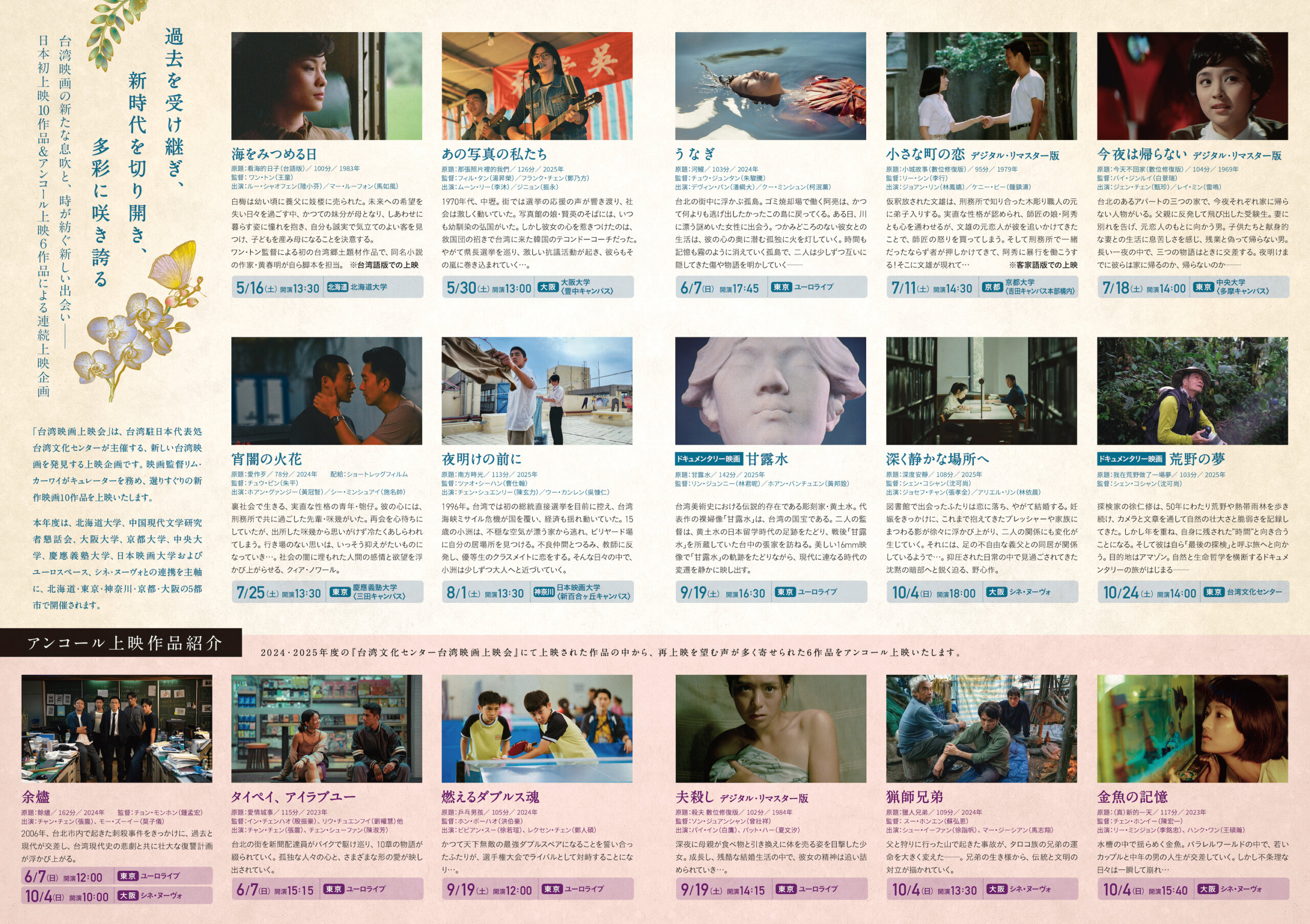 台湾映画はいま、多様な広がりを見せています。さまざまな背景を持つ作り手たちが、それぞれの視点で社会や記憶と向き合い、新しい表現を生み出しています。本年の上映会では、日本初上映作品を中心に、新世代の作品をご紹介します。あわせて、台湾ニューシネマの流れを感じられるデジタル・リマスター作品や、アンコール上映も交えながら、台湾映画の現在とこれまでの歩みをお届けします。また、北海道から関西まで5都市に広がり、大学やミニシアターと連携しながら、より多くの方に台湾映画をお届けできる機会となりました。