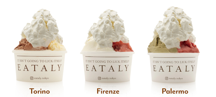 ジェラートで巡るイタリア〈左〉コッペッタ・トリノ ¥1,100〈中〉コッペッタ・フィレンツェ ¥1,000〈右〉コッペッタ・パレルモ ¥1,100 【提供店舗】イータリー銀座店「GRAN CAFFÈ VERGNANO 1882」、丸の内店・日本橋店・原宿店「CAFE&COUNTER」