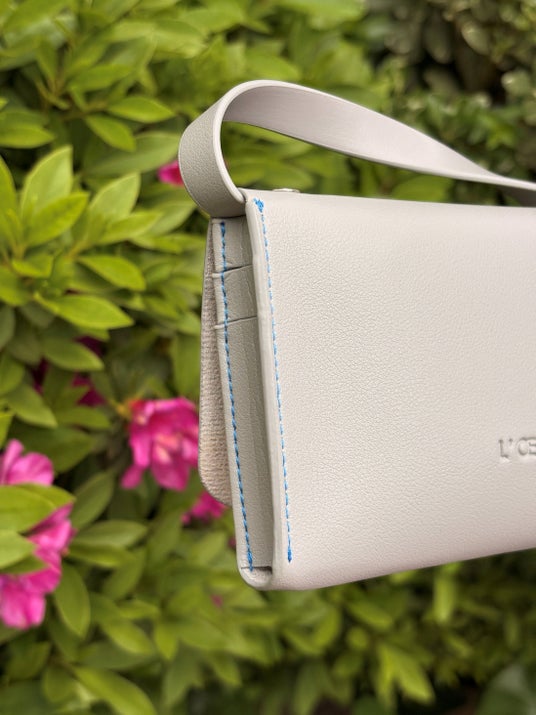 アクセントとして、ライトグレーのボディにキャトル・セゾンSSテーマ「Paris bleu」のテーマカラーのライトブルーのステッチ、フラップ部分のキャトルセゾンの刻印、