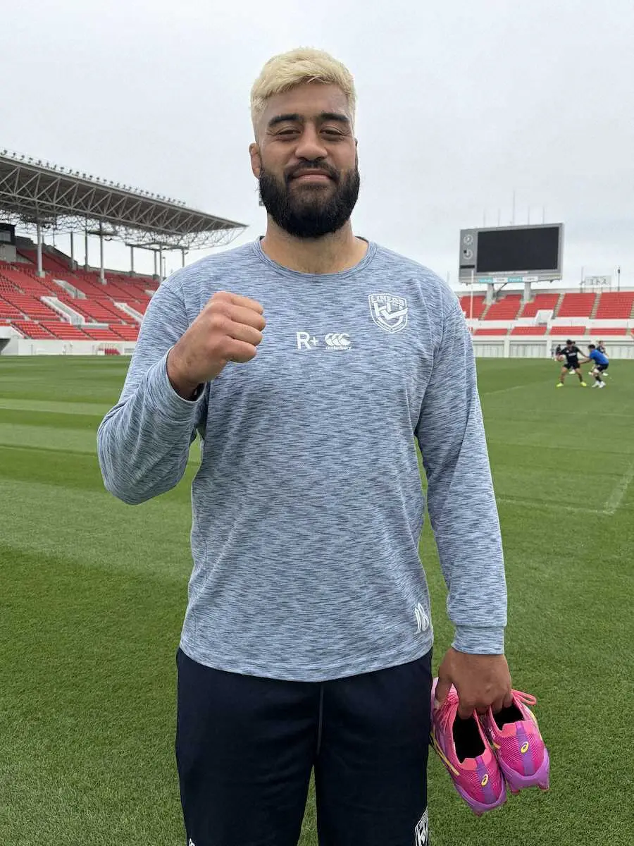 花園ラグビー場での調整を終え、撮影に応じるアキラ・イオアネ