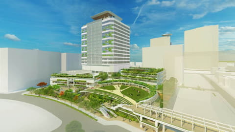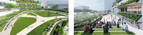 3つ目は、緑あふれる脱炭素型の庁舎であること。立体的に緑化空間を整備し、周辺の公園とつながる緑のネットワークを形成。また、エネルギーを使用せず自然換気等を利用することで環境負荷の低減を図り、ZEB Readyを取得する。次世代型太陽電池の設置や建物全体のエネルギー消費の見える化にも取り組む。