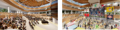 2つ目は、さいたま新都心のまちづくりの一翼を担い、市民が集い・憩える庁舎であること。災害時にも活用される全天候型の中広場には、大型ビジョンや移動観覧席を設置。また、緑豊かな屋外空間として外広場、外広場と連続し、中広場と一体的な利用も可能な階段広場を整備し、日常的に市民が集まれる居場所をつくる。各広場では、様々なイベント開催によるにぎわい創出を図る。