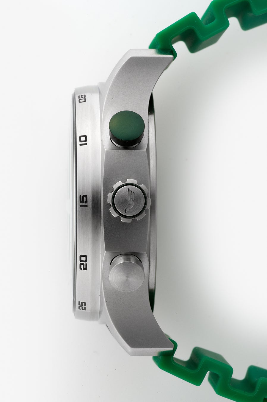 本モデルは、織戸選手の象徴カラーであるグリーンを基調にデザインされた特別仕様。VOSTOK EUROPEの人気ソーラーモデルをベースに、タフネスと実用性を追求したソーラーパワー・クロノグラフとして仕上げられています。