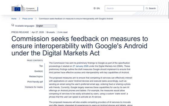 EUは「これらの機能へのアクセスを開放することで、EU全域のAndroidユーザーに幅広いAIサービスの選択肢が提供されます」と主張。提案の有効性について確認するため、2026年5月13日までに、公開協議を通じて意見を提出するよう関係各所に求めました。EUは「関係者およびGoogleから提供されたフィードバックを慎重に評価します」と伝えており、受け取った意見により調整される可能性があるとしています。