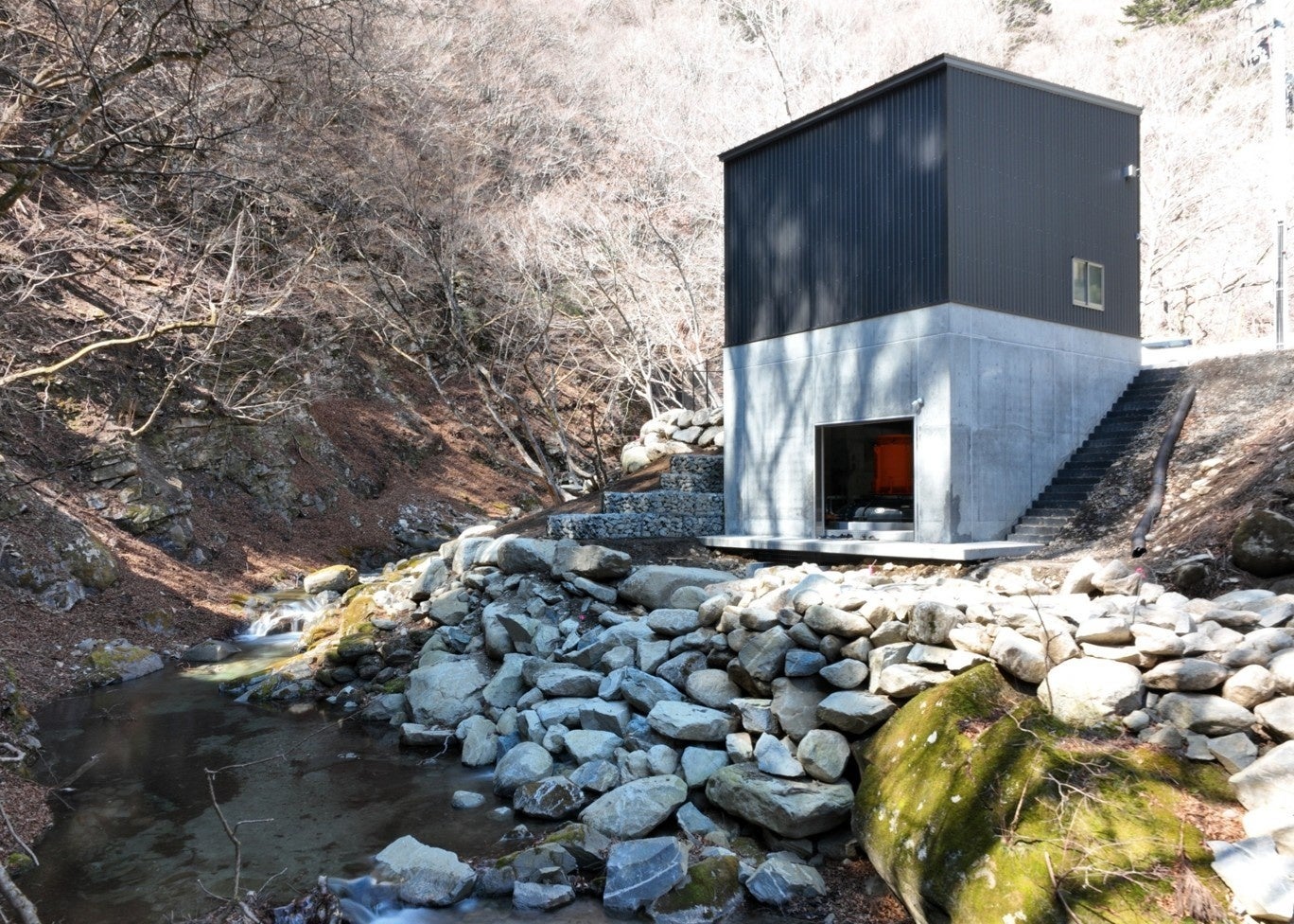 本発電所は、当社が2022年8月に山梨県より「山梨県有林内における小水力発電推進事業者」に選定されたことを受けて建設された発電所です。その後、2023年4月に山梨県と「県有林内における小水力発電事業の実施に関する協定」、大月市と「真木川発電所活用における地域協力協定」を締結すると共に、関係者との協議が整ったことから、TKアクアグリーン株式会社(※)を設立し稼働に向けて進めてきましたが、2026年4月1日、山梨県大月市において真木川小水力発電所の稼働を開始しました。