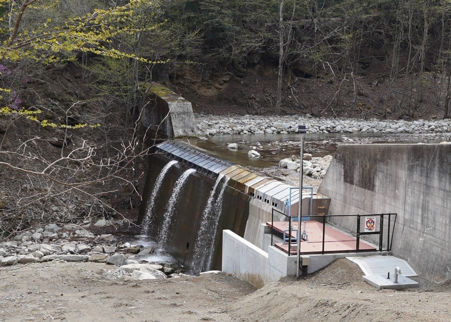 本発電所は、川の流量に応じて発電量が変化する流れ込み式です。そのため、流量が少ない時期には発電量も小さくなります。取水にあたっては、河川環境を保つための必要流量の確保、落葉など河川生態系を支える有機物を可能な限り取り除かない工夫を行っています。また、保安林内での施設整備にあたり、建物の設置や土地の改変に関する厳しい規制に適合した形で開発しています。