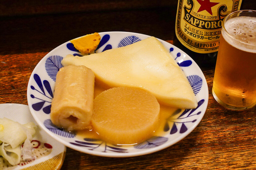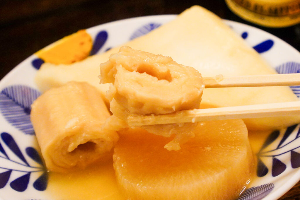 大根は箸がすっと入る柔らかさで、ちくわぶは出汁をたっぷりと吸った深い味わい。練り辛子を少しつけて、ビールの苦味と合わせると最高の肴に変化します。