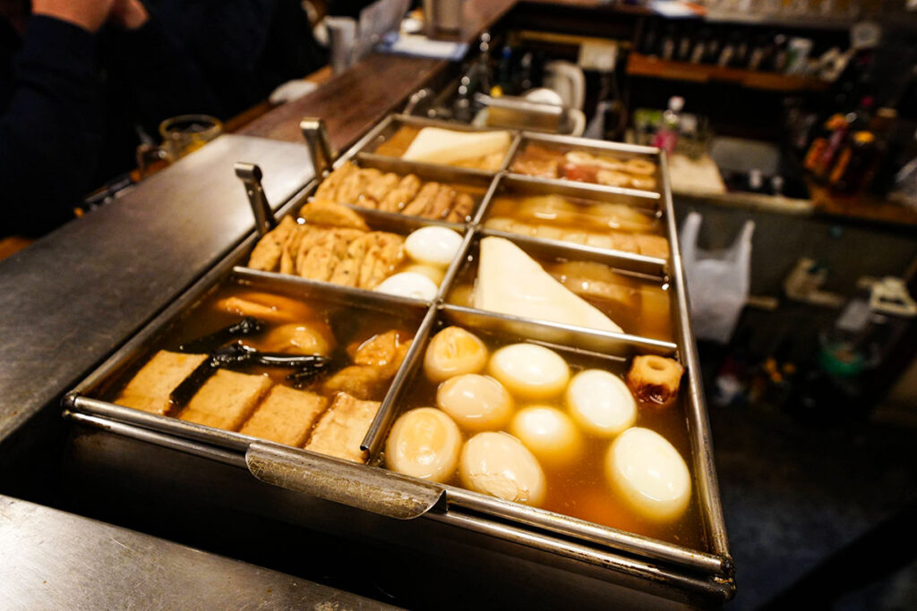 看板メニューのおでんは、一年を通して提供されています。夏場でも冷房をしっかり効かせた店内で熱々を頬張るのが、この店の粋な楽しみ方。