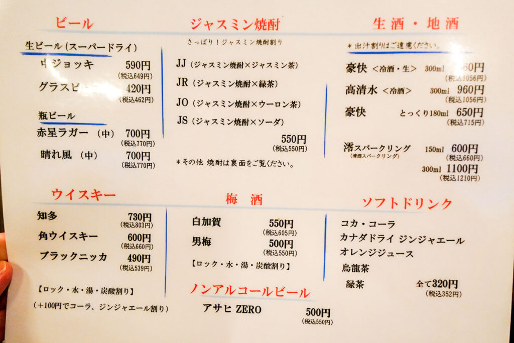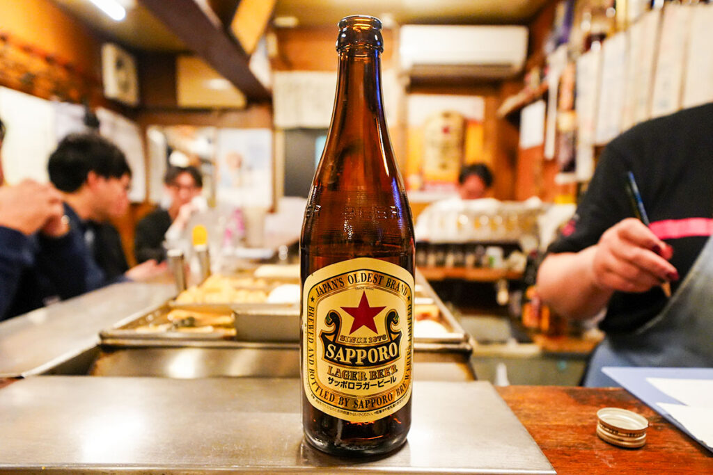 席に着いたら、まずはサッポロラガービールの中瓶(700円)で乾杯。よく冷えたグラスに注ぎ、喉を潤します。