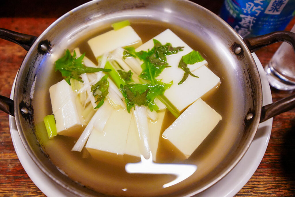 追加で頼んだ品は、おでん鍋とは別に作られる「煮やっこ」。小鍋にたっぷりの出汁と豆腐、ネギが入った一人用の湯豆腐です。