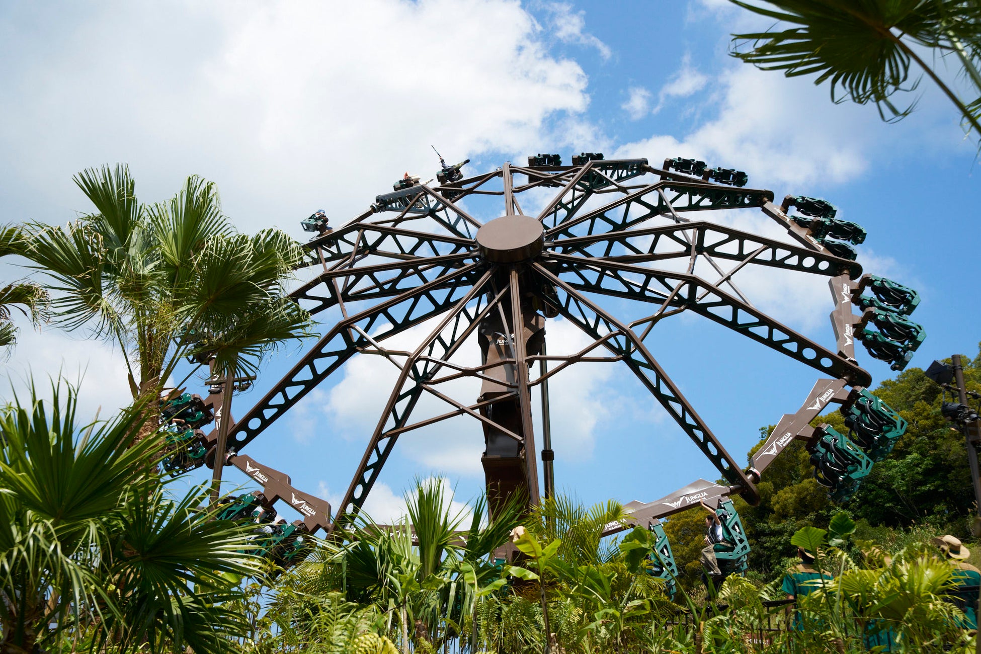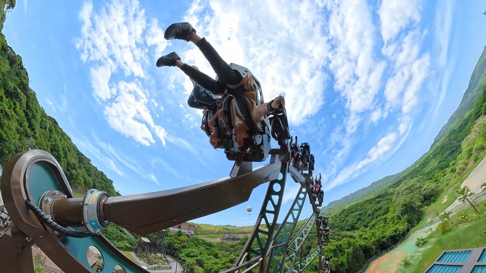 やんばるトルネードは、大自然やんばるの渓谷が広がるジャングル エクストリームズエリアに誕生する、ライド直径約16mのパーク屈指の大型ライドアトラクションです。心地よい風を切って回転しながら動き始めると、アトラクションはだんだんと傾き、最大高度約20mまで到達。やんばるの渓谷の上にそびえたつアトラクションから広大な大自然と青空の絶景を眺めながら、最高到達点では、体は完全に逆さまへ。遠く連なる山々までもが視界の中で渦を巻く、これまでにない超気持ちいい絶叫体験をお届けします。