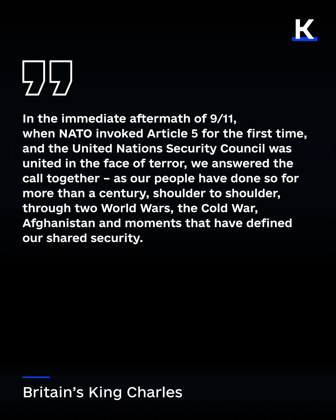 "9/11の直後、NATOが初めて第5条を発動し、国連安全保障理事会がテロに直面して団結したとき、私たちはその呼びかけに共に応えました。2度の世界大戦、冷戦、アフガニスタン、そして私たちの共通の安全保障を規定した瞬間を通して、我が国国民は1世紀以上にわたって肩を並べてそうしてきたのと同じです。" 王様は言いました。
