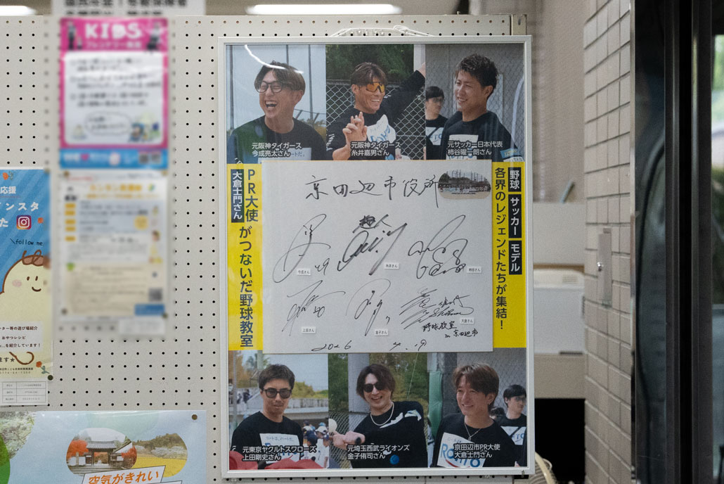 現在、京田辺市役所(京都府京田辺市田辺80)に市のPR大使を務める大倉士門さんと元プロ野球選手4名、元サッカー日本代表(合計6名)のサインの寄せ書きパネルが展示されています!