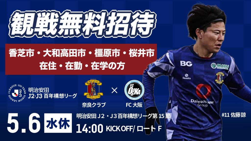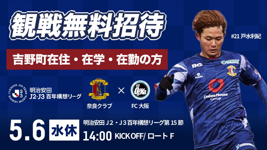 「奈良県サッカー協会2.3.4種にご登録いただいているチーム」の皆さまを5/6(水・休)FC大阪戦へご招待いたします。本企画が奈良県サッカーの盛り上げに少しでも役立てればと思っております。