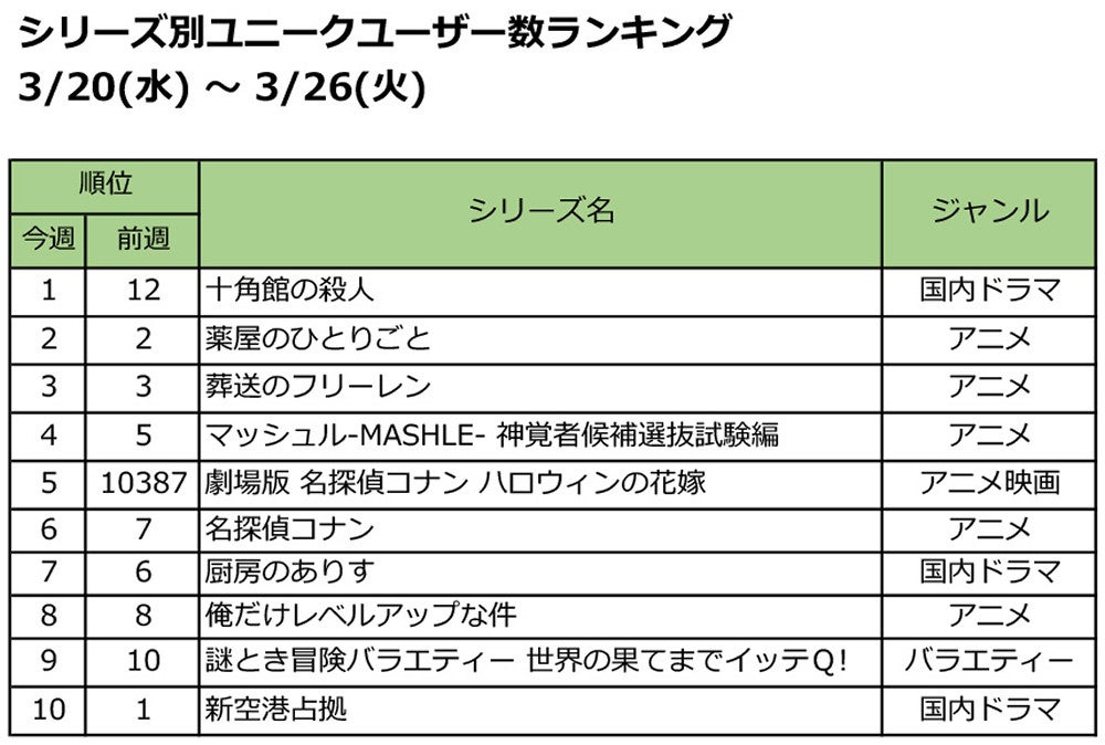 今週1位にランクインしたのは、ミステリー界の巨匠・綾辻行人のデビュー作にして綾辻史上、最高傑作の呼び声高い代表作を実写映像化したHuluオリジナル「十角館の殺人」。