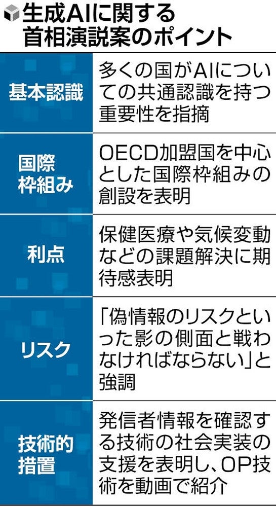 演説原案によると、国際枠組みの名称は「広島AIプロセス フレンズグループ」で、首相は「AIは人類全体に影響を及ぼす革新的技術で、多くの国が共通認識を持つことが重要だ」と呼びかける。生成AIが保健医療や気候変動といった課題解決に貢献するとの期待を示しつつ、「偽情報のリスクといった影の側面とも戦わなければならない」と強調し、OECDの協力を要請する。 日本は昨年、G7(先進7か国)議長国として、生成AIの課題を協議する「広島AIプロセス」を提唱し、初の包括的な国際合意をまとめた。新たな国際枠組みでは、その成果に賛同する国をOECD加盟国を中心に募る。枠組みには、G7各国に加え、EU(欧州連合)加盟国や韓国、シンガポールなどが参加する見通しとなっており、日本政府は参加国のさらなる拡大に向けて、各国に働きかけを続ける考えだ。 首相は演説で、広島AIプロセスでまとめた生成AIのリスクに対処する国際指針や行動規範に言及し、「フレンズグループとともに、世界中の人々が安全、安心で信頼できるAIを利用できるよう協力を進めていく」と訴える。 偽情報対策を巡っては、「技術的措置の積み上げも重要だ」と指摘し、発信者情報を確認する技術の社会実装に向けた取り組みへの支援を宣言する。首相の演説に合わせ、AIのリスクや広島AIプロセスの進展などを紹介する動画を会場で上映し、その中で偽情報の識別に役立つ技術としてOPを紹介する方向で調整している。