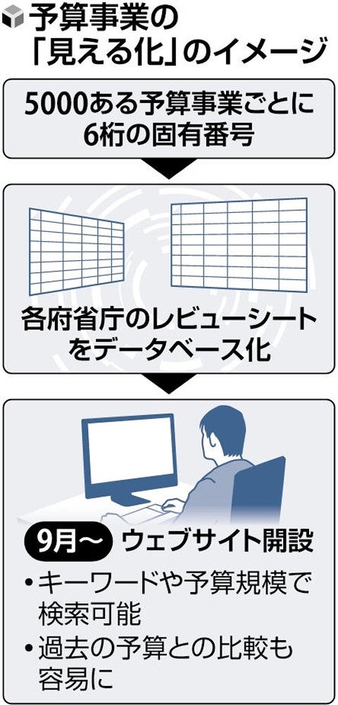 政府は、約5000ある国の全ての予算事業をデータベース(DB)化し、9月にもウェブサイトで一般公開する。各事業に固有の番号を振り、支出先や執行率などを国民が簡単にチェックできるようにする。事業の「見える化」を進め、過去との比較やデータ分析をしやすくし、予算の効率化や無駄の削減も目指す。 内閣官房の行政改革推進本部事務局は、今年度から予算の無駄を点検する「行政事業レビューシート」のDB化に着手している。レビューシートは各府省庁が事業名や概要、予算額や執行額などを入力するもので、DBでは2021年度以降の各事業を管理する。