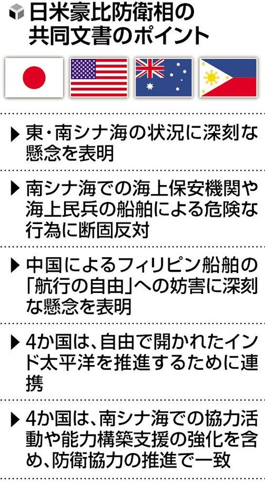 共同文書では、「東・南シナ海の状況について深刻な懸念」を共有し、「防衛協力を更に進める」として、4か国による合同演習を拡大する方針を確認した。フィリピンが中国と領有権を争う南シナ海で、中国の退役軍人や漁民らで構成する準軍事組織「海上民兵」の船舶などが活動を活発化させていることにも触れ、「危険な行為に断固反対する」と非難した。 会談後には、前回は行われなかった日米豪比の防衛相による共同記者会見も開かれた。木原氏は「4か国が結束し、ルールに基づく国際秩序と自由で開かれたインド太平洋の実現を、国際社会に発信し続ける」と述べた。オースティン氏は「地域の課題に対応するため、相互運用性を高め、情報共有を進める必要がある」と訴え、4か国の連携強化を急ぐ考えを強調した。 木原氏はオースティン、マールス両氏と個別にも会談したほか、日米豪3か国の防衛相による会談も行われた。 日米防衛相会談では、4月の日米首脳会談で合意した、自衛隊と在日米軍の指揮統制枠組みの向上について、議論を進めることで一致した。日米豪の防衛相は、先端防衛技術分野での共同開発・研究の促進に向けた取り決めの文書に署名した。F35戦闘機による3か国の共同訓練を、それぞれの国で実施することでも合意した。