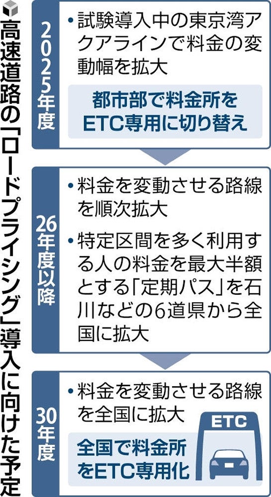 現在は、千葉県木更津市と川崎市を結ぶ東京湾アクアライン(全長15・1キロ・メートル)で24年度末までの社会実験として行われている。通行料はETC(自動料金収受システム)搭載の普通車で800円だが、混雑することが多い土日と祝日には、川崎(東京)方面に向かう上り線で午後1~8時は1200円と高くし、午後8時~午前0時は600円に抑えている。 ロードプライシングで時間帯やルートによってきめ細かな割引を行うには、料金所がキャッシュレスのETC専用であることが望ましい。ETC専用化は首都圏などの都市部で25年度頃に、地方で30年度頃までに実現する計画だ。 政府内では、25年度にアクアラインで料金の変動幅を広げる見直しを行い、26年度から順次、路線を拡大させる案が浮上している。 8月頃から国土交通省の審議会で対象エリアなどの制度設計に関する議論を始め、国交省と各高速道路会社などの協議で具体的な料金体系を定める。 一般道路の混雑解消のため、特定区間を多く利用する人の高速道路料金を最大半額にする「定期パス」の制度についても、26年度以降、通勤者を対象に試験導入中の石川、北海道、新潟、山梨、香川、長崎の6道県から全国に拡大させる。 渋滞が緩和されれば、車のアイドリング時間が減って脱炭素につながり、バスなどの公共交通機関が定時運行しやすくなる。骨太の方針には、渋滞緩和と温室効果ガス排出を実質ゼロにする「カーボンニュートラル」の両立を図る観点から、「柔軟な料金体系に転換する」と明記する見通しだ。 岸田首相は4月、斉藤国交相に高速道路の料金体系見直しについて検討を指示していた。