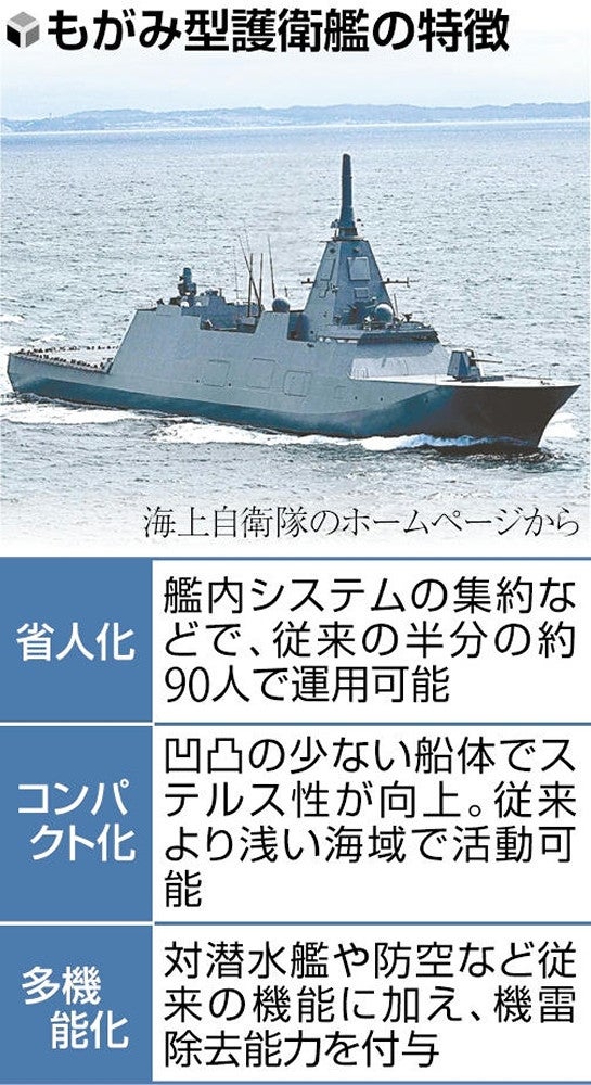 防衛省は、2022年に1番艦が就役した「もがみ型」護衛艦をベースに、豪政府が求める装備や機能などを追加する開発を検討している。「もがみ型」は、艦内システムの集約などで従来の半分の約90人での運用が可能で、従来の護衛艦にはなかった機雷除去能力を備えている。同省は「豪側が重視する