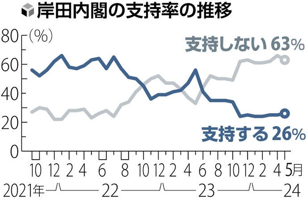 読売新聞社は17~19日、全国世論調査を実施した。岸田内閣の支持率は26%で、前回調査(4月19~21日)の25%からほぼ横ばいとなり、7か月連続で2割台に低迷している。不支持率は63%(前回66%)。