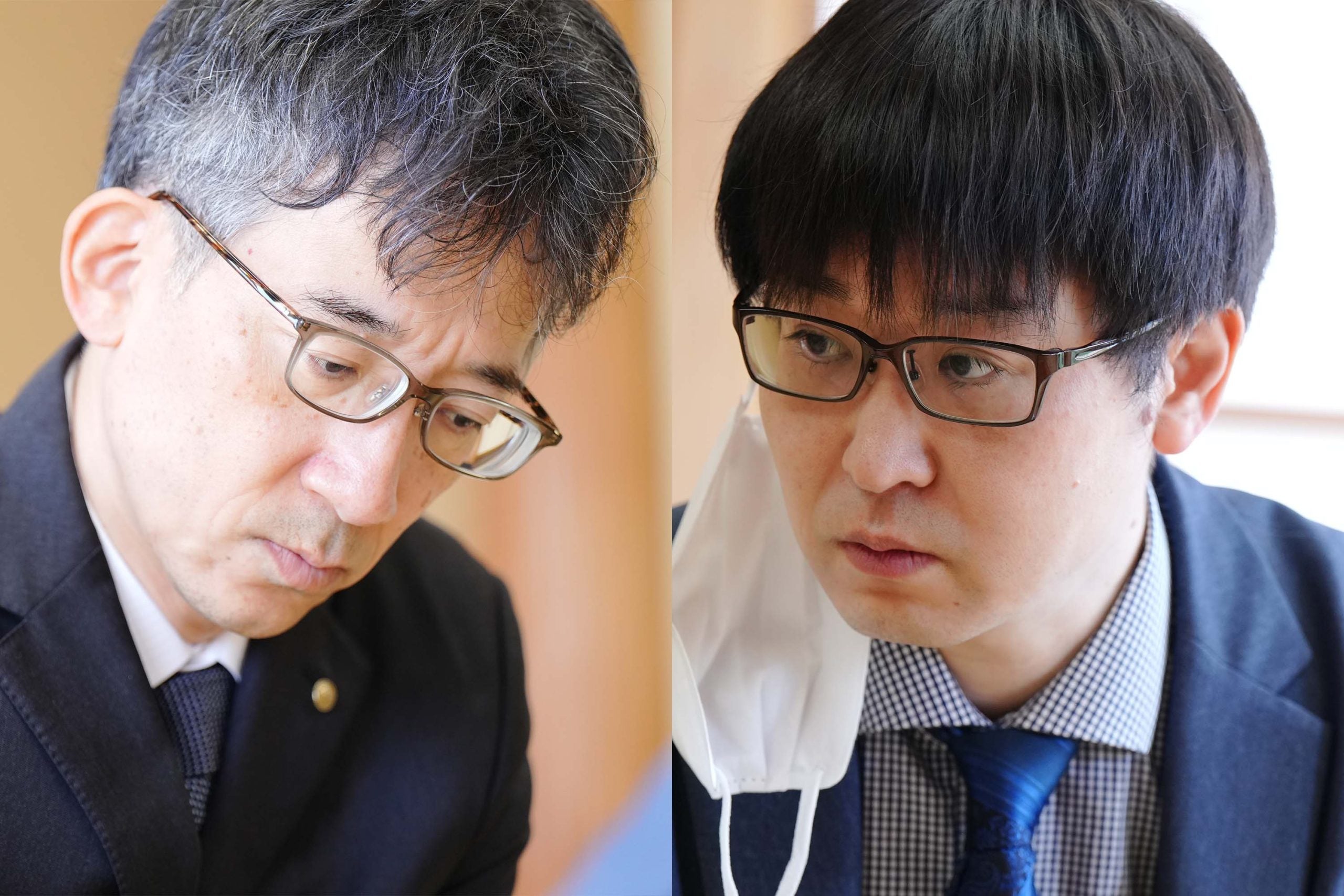 対局に臨む佐藤九段(左)と山崎八段=若杉和希撮影
