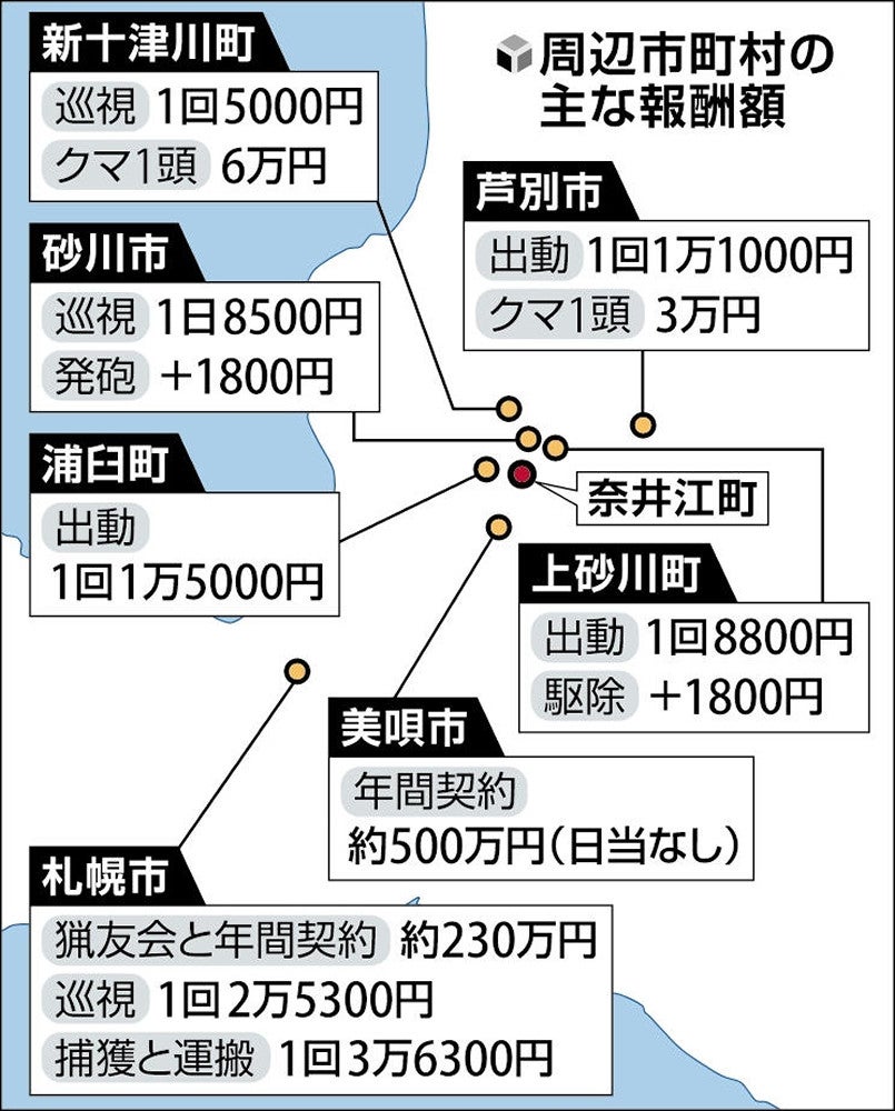 町が示した報酬は、日当4800円、出没地周辺の見回りなどのヒグマ対策が3700円。このほか発砲した場合1800円が支給される。業務には駆除したクマを軽トラックなどで処理場に運搬し、焼却処分するための解体といった作業が盛り込まれている。山岸部会長は「妥当な金額とは思えない」と訴えている。 町では昨年、約20件のクマの目撃情報があり、ゴルフ場に出没した際は、町からの要請を受けた猟友会が、出動した。町は今後も奈井江部会と協議する方針という。近隣自治体は増額の動きも 読売新聞のまとめでは、奈井江町に比べて高い報酬を設定する自治体は複数ある。浦臼町は出動したハンターに対し、駆除の有無にかかわらず1日1万5000円を支払う。芦別市は出動1回で1万1000円、駆除した場合は1頭3万円を支払っている。 奈井江町の近隣では昨年、クマの出没が増えたことで報酬を増額する動きもある。美唄市では今年度、地元猟友会と年間契約するための予算を昨年度から128万円増やし、506万円とした。新十津川町では駆除した場合1人あたり1万9000円としていたが、今年度から1頭あたり6万円支払う方式に変更。2~3人で出動すると想定し、1人最低2万円確保できるように調整している。 北海道猟友会によると、報酬額は市町村が地元猟友会などと協議して個別に決めている。札幌市では半日の巡視で1人あたり2万5300円支払われる。一方、巡視では日当がない自治体もある。猟友会の斉藤哲嗣専務理事は「クマへの対応はどこでも命がけ。一般論だが、近隣と報酬の差が大きい場合、少ない方が不満を持つことはあり得る」と話した。