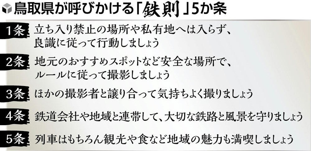線路沿いの柵を壊される被害も起きており、鳥取県の平井伸治知事は4月、ルールを守った撮影を呼びかける「鉄則」を提唱し、県のサイトに掲載。JR西や自治体が協力し、沿線の撮影スポットに計300台分の駐車場を応急的に確保した。