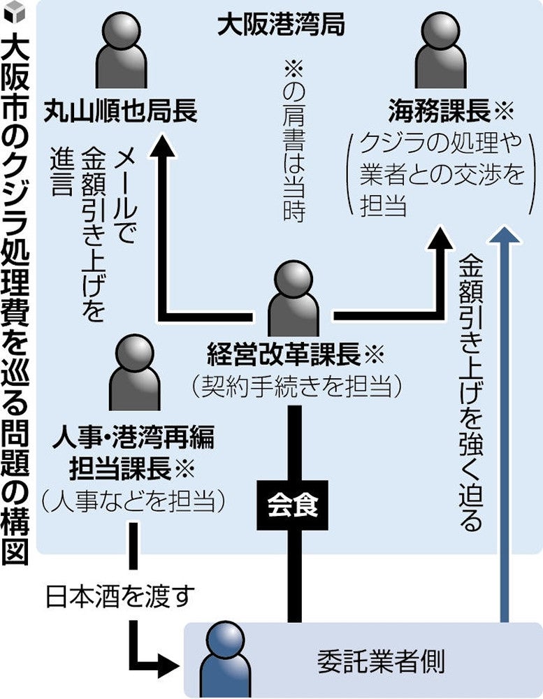 当時の経営改革課長を巡っては、昨年3月27日に行われた同社との交渉に同席し、金額の引き上げを交渉担当の海務課長(当時)に強く迫っていたことが判明している。経営改革課長は引き上げに慎重な海務課長に対し「お前ええ加減にせえよ」などと発言していた。 同局の丸山順也局長は市議会で、「経営改革課長に主体的に交渉を進めるよう指示したことはない」と説明し、金額は合理的な根拠をもって算出したと主張した。一方で、経営改革課長が交渉に同席し、金額の引き上げを求めた行為は「本来の役割を越えており、適切であったとは言えない」と述べた。 同社との契約を巡っては、市監査委員が今年4月、作業の履行を十分に確認しないまま船の清掃費を計上するなど「多くの疑義がある」と指摘していた。市契約管財局が適正だったかを調べている。 丸山局長は「報告や連絡、相談が徹底されず、指示内容や対応方針の共有が不十分になったことなど、組織全体としてのガバナンス(内部統制)の不足が様々な疑義を指摘されることにつながった。大いに反省している」と強調。「今回の事案全般について局を挙げて改めて検証し、ガバナンスの強化など強い決意で取り組む」と述べた。 大阪港湾局では、昨年1月下旬に人事・港湾再編担当課長(当時)が同社を訪ね、日本酒を贈っていたことも明らかになっている。随意契約の総点検 市長表明 大阪市の横山英幸市長は23日の市議会建設港湾委員会で、クジラの処理費を巡る問題を受け、市発注の随意契約が適正かを総点検する方針を明らかにした。 クジラの処理は、緊急性や特殊性があったとして、一般競争入札ではなく、1社のみの見積もりによる「特名随意契約」で行われた。この日の委員会で、公明党の市議が「市民は、競争性や金額の決定で不透明になりかねない随意契約自体への不信感を抱いている」と述べ、随意契約の総点検を求めたのに対し、横山氏は「他の随意契約でも不適正な事象が発生していないかを調査することは必要だ」と応じた。今後、契約業務を所管する市契約管財局で、調査内容を詰めるという。◇ この問題を巡っては、市大阪港湾局は、委託業者との金額の交渉が難航する中、顧問弁護士から当時の松井一郎市長らに早急に相談するよう助言を受けながら、報告していなかったことも判明している。松井氏は23日、「僕に何の報告相談もなかったのは、大変遺憾。問題点は港湾局の体質(や)内部統制」と自身のX(旧ツイッター)に投稿した。市民グループが市長を提訴 大阪市のクジラの死骸処理費を巡る問題で、市民グループ「見張り番」は23日、横山英幸市長を相手取り、契約の締結に関わった市職員3人と委託業者に8019万円の損害賠償を請求するよう求める住民訴訟を大阪地裁に起こした。 訴状などによると、市職員は、市大阪港湾局の丸山順也局長と、クジラの処理を担当した海務課長(当時)、契約担当だった経営改革課長(同)。原告側は、市が契約の際に他の業者から見積もりを取らなかったことなどから処理費が高額になったとし、「違法な随意契約で、市に損害を与えた」と主張している。 横山市長は記者団に対し、「適正に事務が行われたのか、調査を進めている」と述べた。