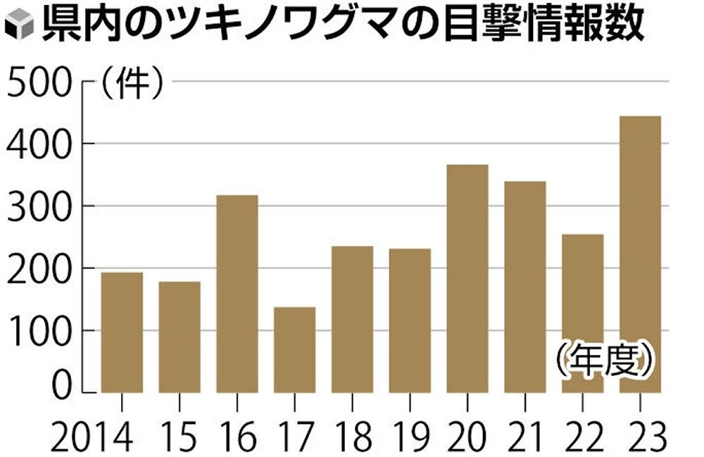 2023年度に山口県内でツキノワグマが目撃されたり、足跡が見つかったりした件数が444件に上り、統計を開始した1997年以降で最多になったことが、県のまとめでわかった。今年度も23年度と同じペースで目撃情報が寄せられており、県は警戒を呼びかけている。(小野悠紀)