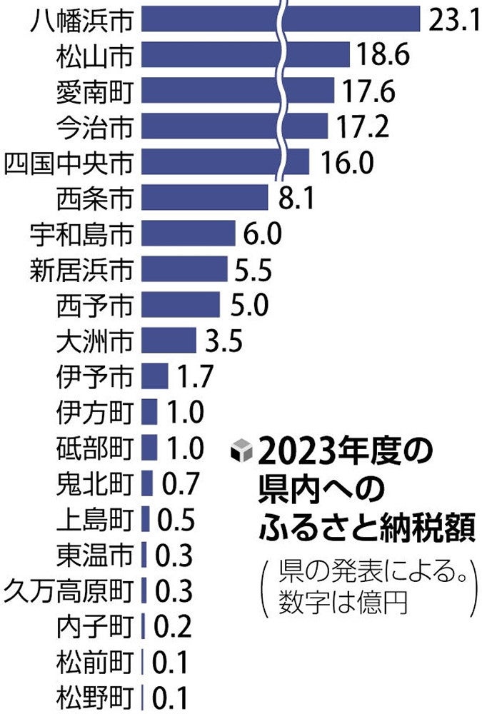 愛媛県と県内20市町に寄せられたふるさと納税の2023年度の寄付額(速報値)は前年度比45%増の計127億7953万円となり、6年連続で過去最高を更新した。特産の