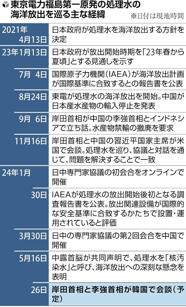首相と会談する予定だ。会談で岸田首相は、処理水放出を受けた日本産水産物の輸入禁止措置の撤廃を求める方針だが、専門家協議での日中双方の主張は平行線をたどっており、解決に向けた進展は見通せない状況だ。