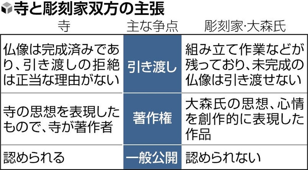讃岐国分寺と彫刻家 弘法大師・空海が構想し、造立後に焼失した大日如来像を約500年ぶりに再現する計画を巡り、高松市にある四国八十八か所霊場札所の讃岐国分寺と制作した彫刻家が対立し、一般にお披露目できない事態に陥っている。仏像が完成したかどうかで双方の主張が異なり、司法の場で所有権や著作権を争っているためだ。公開を待つ市民らからは戸惑いの声も上がる。(足立壮)所有・著作権巡り