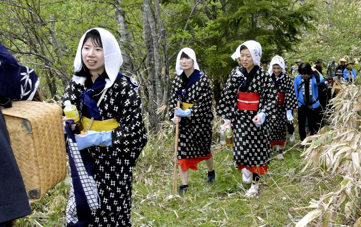 岐阜県高山市高根町と長野県境にある野麦峠(標高1672メートル)で26日、「野麦峠まつり」が行われた。野麦峠は古くから飛騨と信州を結ぶ重要ルートで、明治から昭和初期にかけ、飛騨の若い女性が信州の製糸工場へ出稼ぎに行くために越えた難所。まつりは、いにしえの人々の苦難に思いをはせながら、地元の子どもらが当時の衣装を着て峠道を行列をつくって歩く。この日は、岐阜県側の参加者約10人が長野県からの参加者と野麦峠で合流。工女などに扮(ふん)して約1キロを歩いた。野麦峠は近くの長野県松本市側の道路が4月中旬に土砂崩れなどで通行止めとなり、今月14日に復旧して通行できるようになった。(早坂直樹撮影)