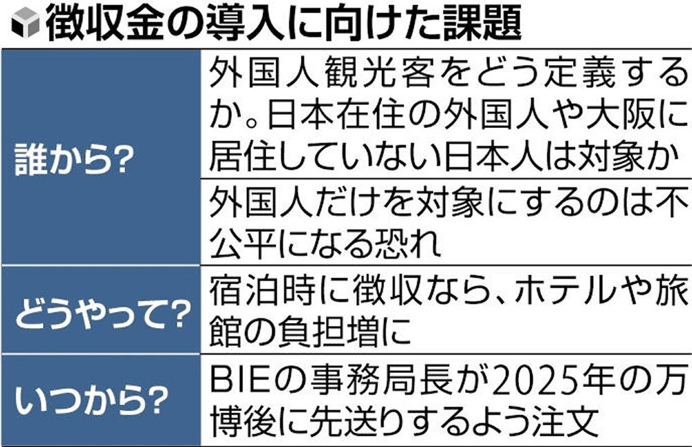 4月24日には、徴収金のあり方を検討する府の有識者会議の初会合が開かれた。税制や観光政策を専門とする大学教授ら7人の委員が、徴収金の具体的な使途や徴収方法を検討し、答申を出す方針。