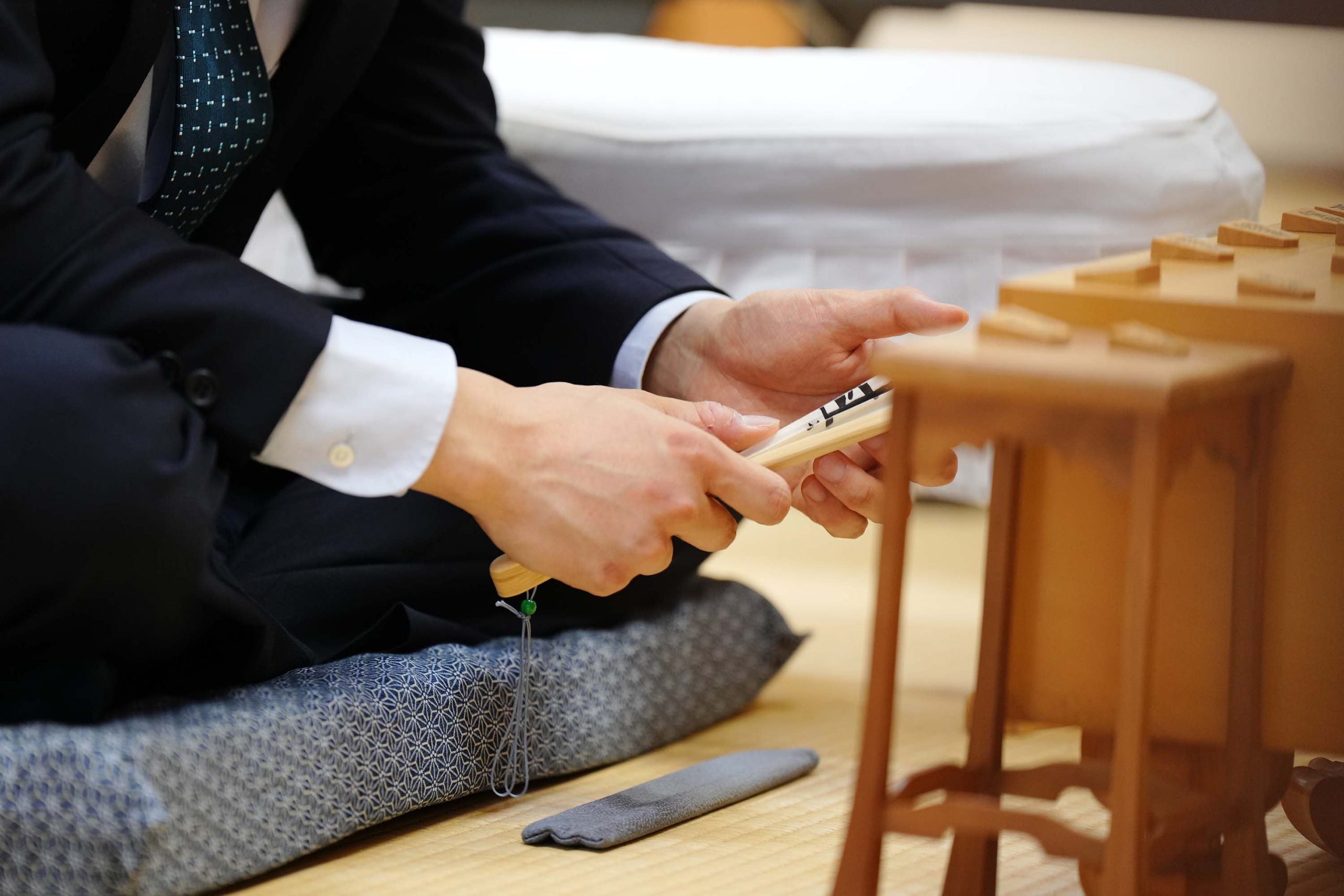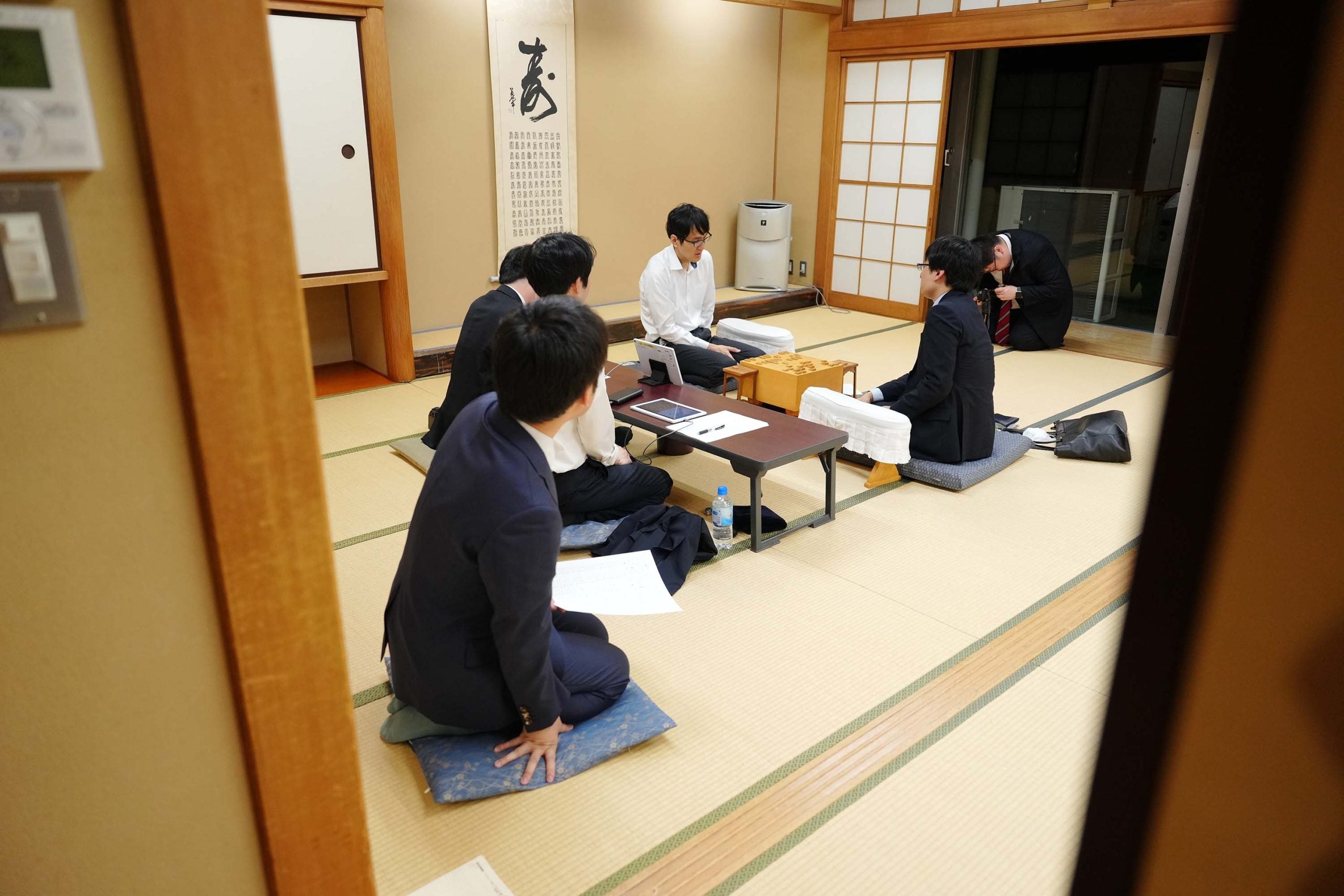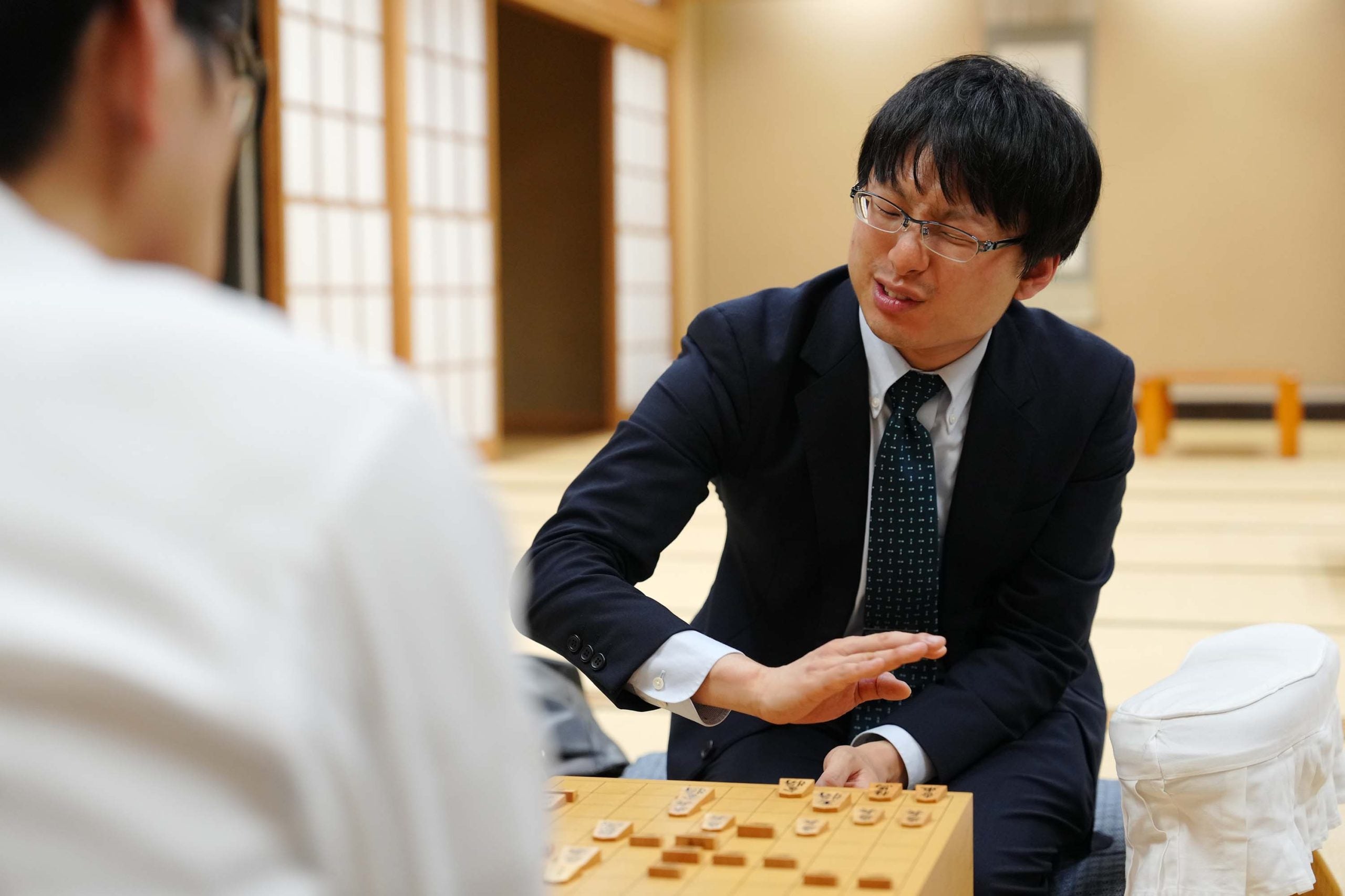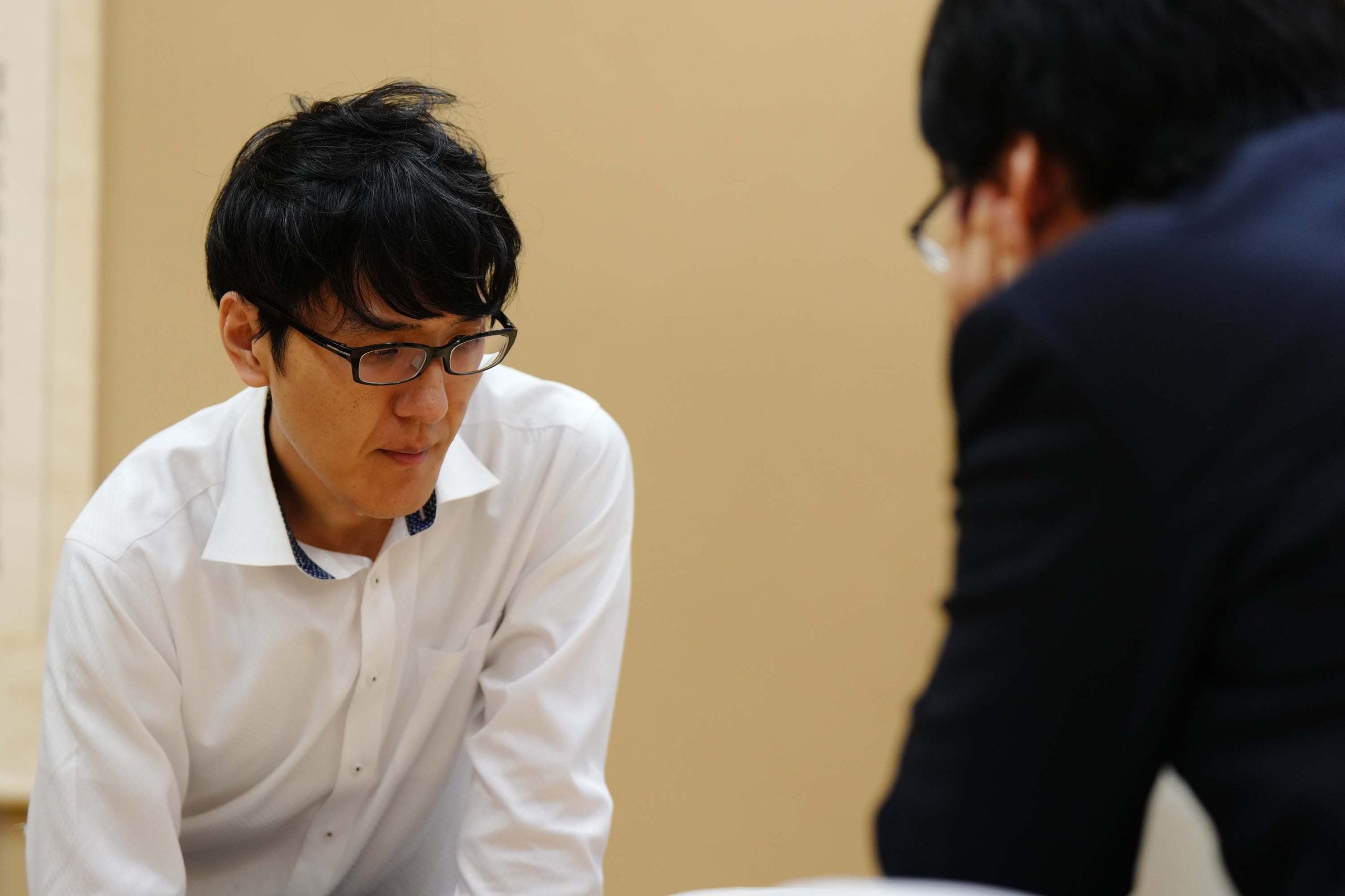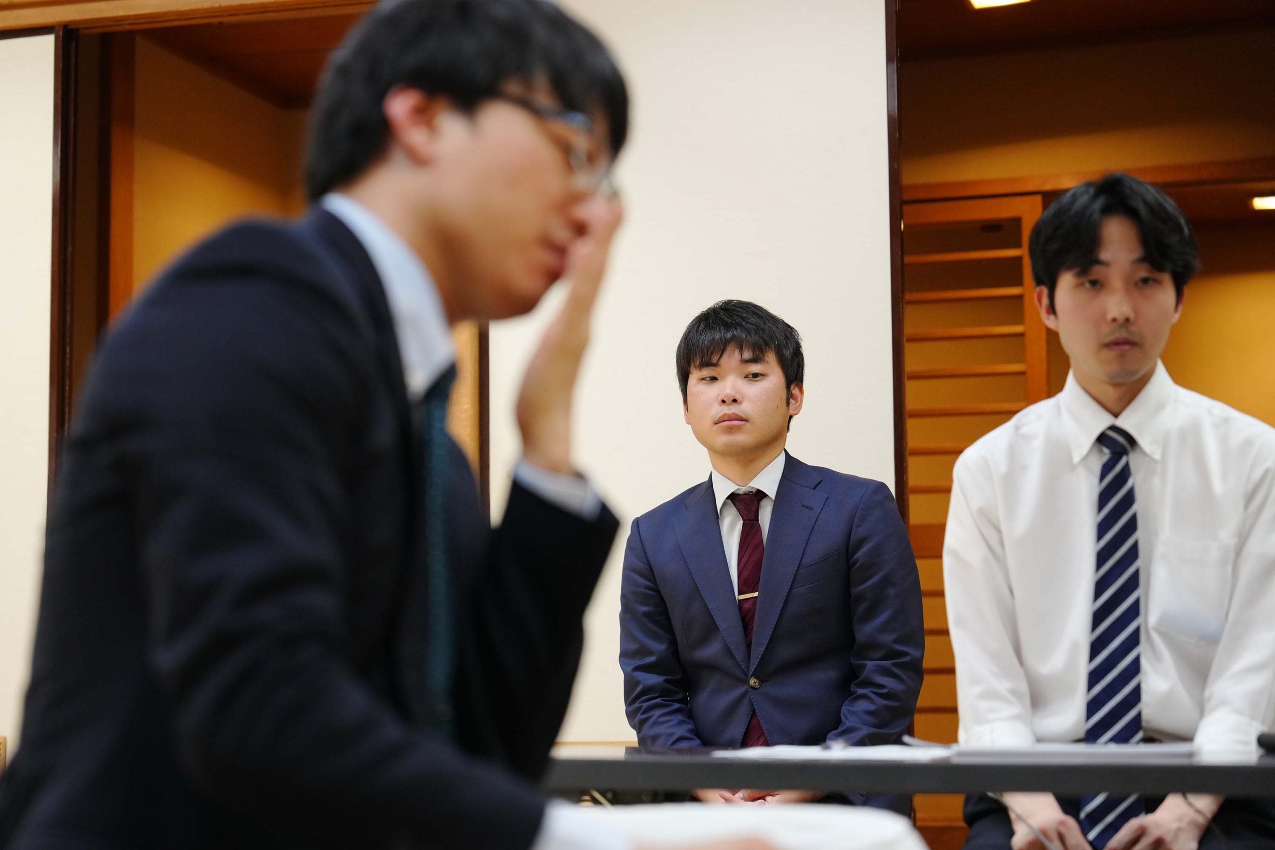 八代七段が感想戦を見守った=若杉和希撮影