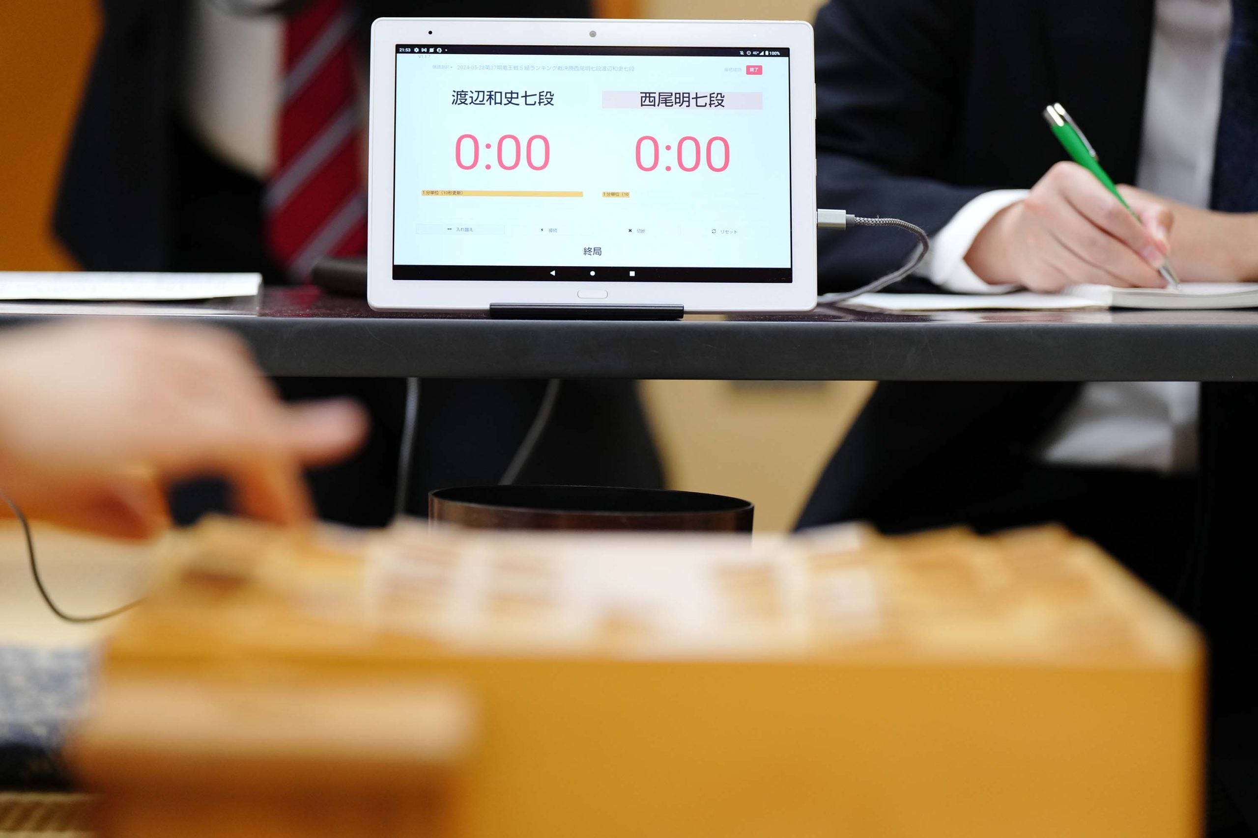 渡辺七段が先手となった本局。後手の西尾七段は一手損角換わりの作戦に。渡辺七段は▲4六銀と繰り出し3筋から動きました。西尾七段は昼食休憩を挟んで長考。1時間16分使って△4五歩と反発しました。午後は渡辺七段が長考返しで、1時間9分使って▲1八飛。後手の攻め、先手の受けと、棋風が色濃く出た中盤戦になりました。