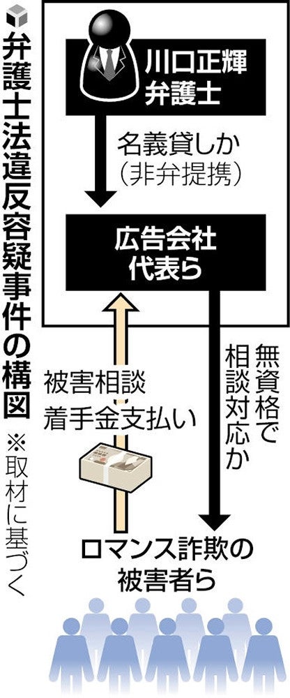 関係者によると、川口弁護士は2022年以降、広告会社代表らに弁護士名義を貸し、複数の詐欺被害者の相談に対応させた疑いが持たれている。 弁護士法は、弁護士が名義を無資格者に貸す「非弁提携」、弁護士資格がないのに報酬目的で法律事務を行う「非弁活動」を禁じている。詐欺の被害金回収は法律事務にあたる。 川口弁護士は、恋愛感情を抱かせて金をだまし取るロマンス詐欺の被害金回収を請け負う専用サイトを開設し、被害者からの相談を電話やLINEで募っていた。実際の相談対応は、広告会社から派遣されて関東地方で勤務する事務員が担い、川口弁護士は被害者に面談や十分な説明などをしていなかったとされる。 大阪弁護士会の調査に対し、川口弁護士が提出した依頼者のリストでは、22年8月~23年11月に約1800人から依頼を受け、着手金は1件あたり20万~300万円で総額が9億円を超えた。川口弁護士は「着手金の大半は広告会社に渡していた」と述べ、被害金を回収できたのは10人程度だったと明かしたという。 川口弁護士は今年2月、読売新聞の取材に「(大阪弁護士会の懲戒請求には)異論がある。(非弁提携について)否定している」と述べていた。 ロマンス詐欺は、外国人になりすました相手とSNSなどで連絡し、一度も会わないままだまされるケースが多いため、実際に被害金を回収できる確率は極めて低く、弁護士に着手金を支払ったのに被害金が戻らない「二次被害」が問題化している。