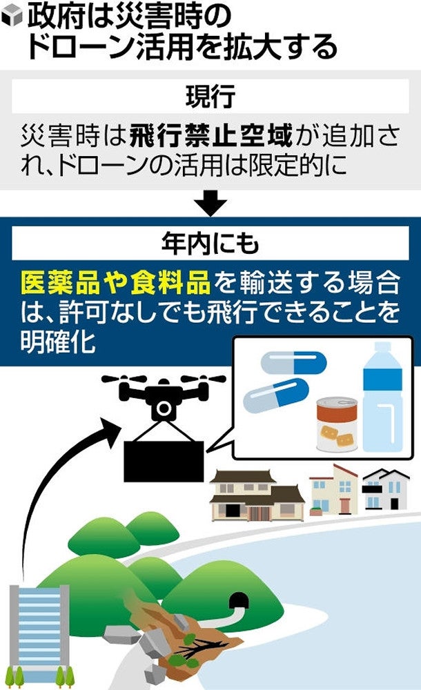 政府は、災害時のドローン活用を拡大する方向で最終調整に入った。医薬品や食料品など支援物資の輸送であれば、飛行禁止空域でも許可を得ずに飛行できる仕組みの規制緩和を検討しており、規制改革推進会議が31日にもまとめる答申案に明記する見通しだ。6月に閣議決定する規制改革実施計画に盛り込み、年内にも実施する。