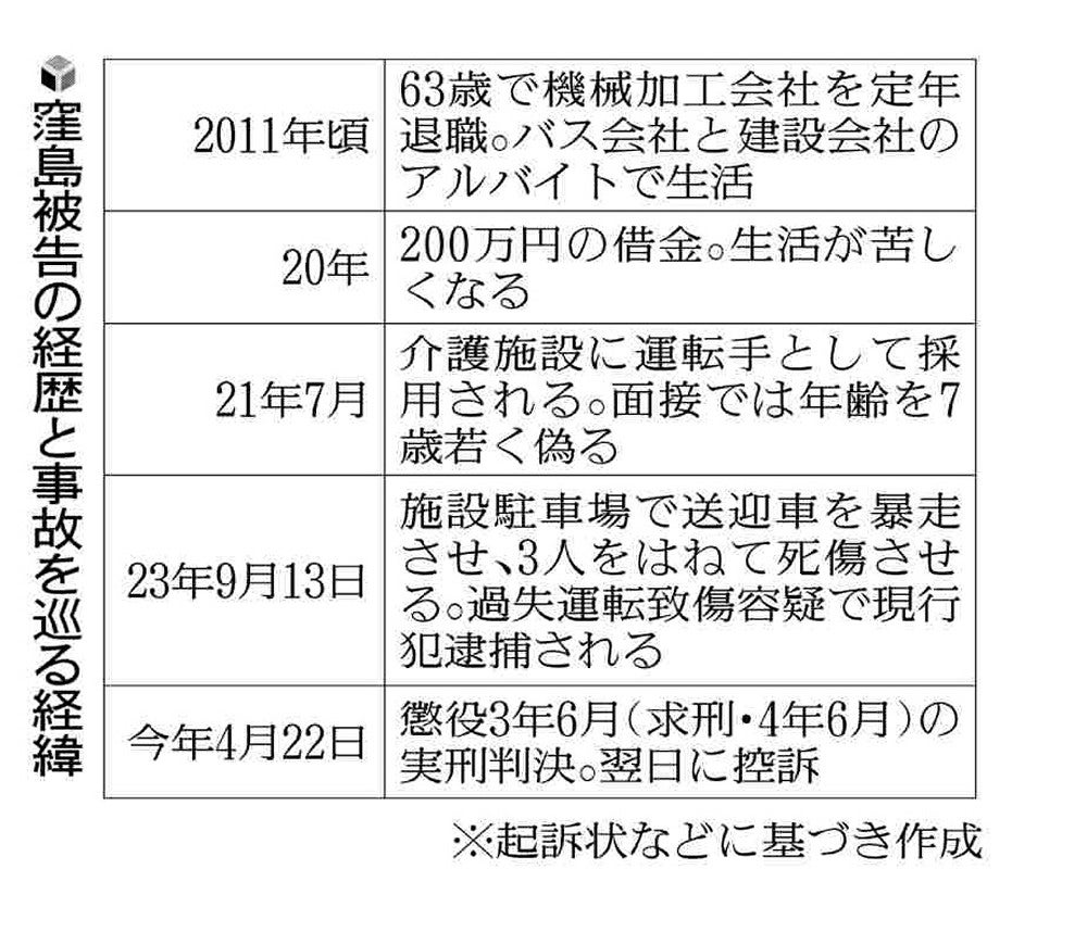 1審判決によると、男は昨年9月、介護施設駐車場で送迎車のアクセルを誤って踏み、高齢の利用者2人をはねて死亡させ、職員にけがを負わせた。 公判や関係者によると、男は63歳の時に機械加工会社を定年退職した。貯蓄が少なく、頼れる親族もなかったことから、バス会社と建設会社でのアルバイトを始めた。だが、70歳代前半、200万円以上の借金を背負った。年金を含め当時の月収は約20万円。生活は困窮した。 三つ目のアルバイト先として見つけたのは介護施設の運転手だった。「どうしても採用されたい」との動機から、面接では年齢を7歳若く偽った。採用後には、生年月日欄を偽造した免許証のコピーを施設側に提出。採用から約2年後、男は事故を起こした。求人倍率4倍 様々な業種で人手不足感が強まる中でも、介護業界は深刻だ。厚生労働省によると、昨年度の介護関係の職種の有効求人倍率は4・07倍で、職種全体(1・17倍)を大きく上回った。 特に、男が採用された2021年夏頃は新型コロナウイルス流行の真っただ中で、家庭内感染の恐れがあることなどから、介護施設に入所を希望する高齢者が多かったという。 事故が起きた施設の運営会社の神山光代表(53)は「元々人手不足だったが、コロナ禍の特需でより深刻になった。各施設を管理する本部から、人を派遣してもらっている状況だった」と振り返る。「人を選べない」 介護業界では職員の高齢化も進む。厚労省のまとめでは昨年、医療・福祉施設などで働く介護職員の平均年齢は44・4歳で、10年前から6歳ほど高くなった。 さいたま市西区の特別養護老人ホーム「三恵苑」の職員50人の平均年齢は51・7歳。施設長の皆川慎一郎さん(42)は「若い人材が必要だが、求人を出しても応募は少なく、人を選べる状況ではない」とぼやく。夜勤に入ったりと体力仕事も多いが、面接で体力的に問題がないことを確認できれば、採用するという。 介護施設では利用者の送迎が欠かせない。職員の高齢化によって、事故のリスクが高まっている。警察庁によると、75歳以上の運転者による死亡交通事故は昨年384件発生し、3年連続で増加している。事故原因で多いのがハンドル操作のミスや、アクセルとブレーキの踏み間違いなどだった。 介護施設職員の高齢化について、淑徳大の結城康博教授(社会保障・福祉)は「仕事を必要とする高齢者が、介護職や運転手といった比較的採用されやすい職種に集中する傾向がある。『高齢者の仕事』との認識が定着してしまうと、さらに若い人が入ってこなくなってしまう」とみている。