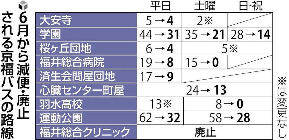 京福バスによると、8路線では、朝夕の通勤・通学時間帯の便数は維持する一方、利用者の少ない日中や夜間を中心に、平日は76便、土曜は78便、日曜・祝日は63便を減らす。商業施設「ショッピングシティ・ベル」(福井市花堂南)などを経由する運動公園線は平日、土日・祝日ともに各30便少なくする。 また、平日に13便、土曜に12便運行していた福井総合クリニック線は5月末で廃止する。