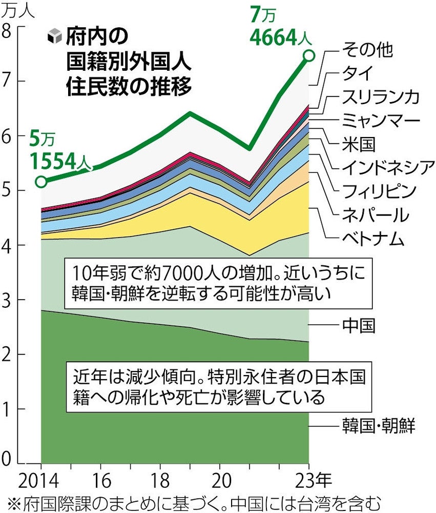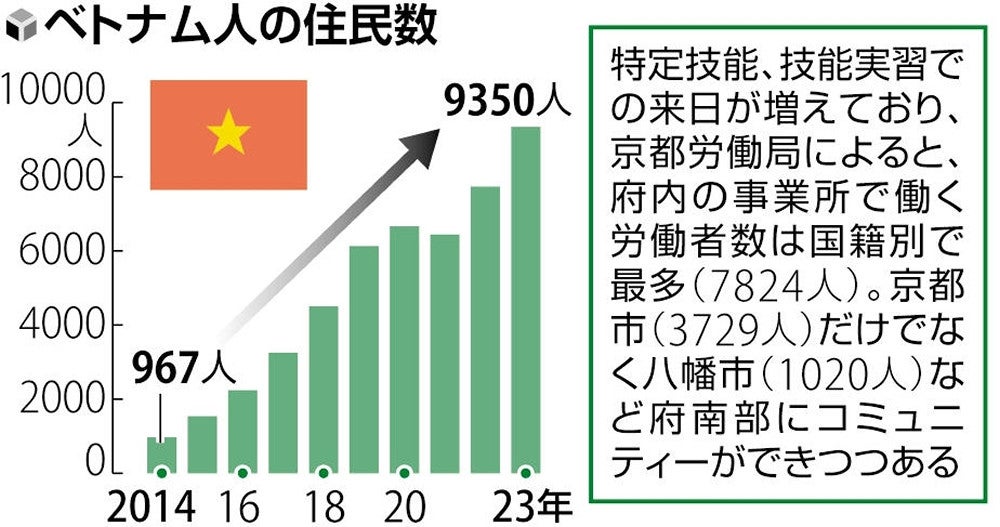 京都府内に住む外国人が、過去最多ペースで増えている。昨年末時点で7万4664人となり、コロナ禍前と比べて1万人以上増えた。留学や技能実習、家族滞在の伸びが大きく、特にベトナム、ネパールからの来日が目立っている。府のデータを読み解いた。(上村真也)コロナ後回復