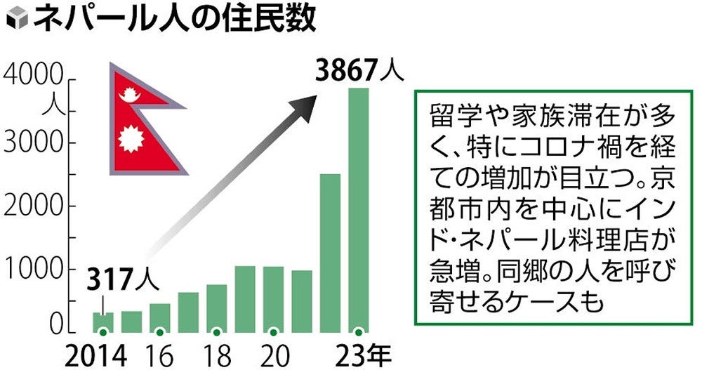 新たな動きとして注目されているのがネパールだ。京都市内でも、ネパール国旗がはためく飲食店が急増。日本語学校で学ぶ若者も増えている。ネパールは国内産業に乏しく、海外に活躍の場を求める人が増えているという。京都市内で飲食店を営む40歳代のネパール人男性は「京都は住みやすいとネパールでも話題になっている。最近では家族や親族を招くケースも増えている」と話す。京都、宇治に8割