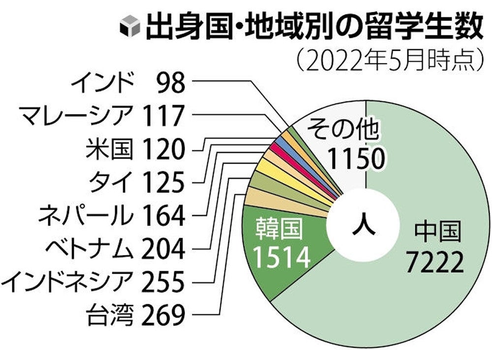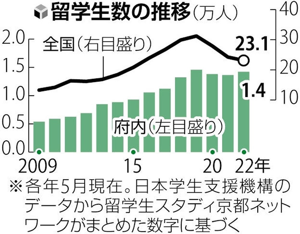在留資格別で目立つのは留学生だ。全国に比べても伸び率が高く、「大学の街でもある京都の特性が影響している可能性が高い」(府国際課)という。22年5月時点で1万4205人が学び、その後も増加傾向にある。 最長2年の日本語学校に比べ、大学はじっくり時間をかけて学ぶため、コロナ禍の瞬間的な影響も表れにくかった。